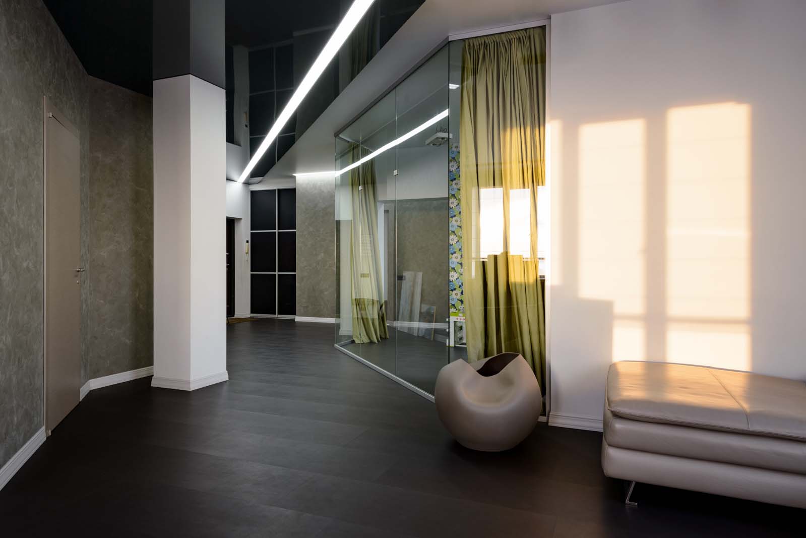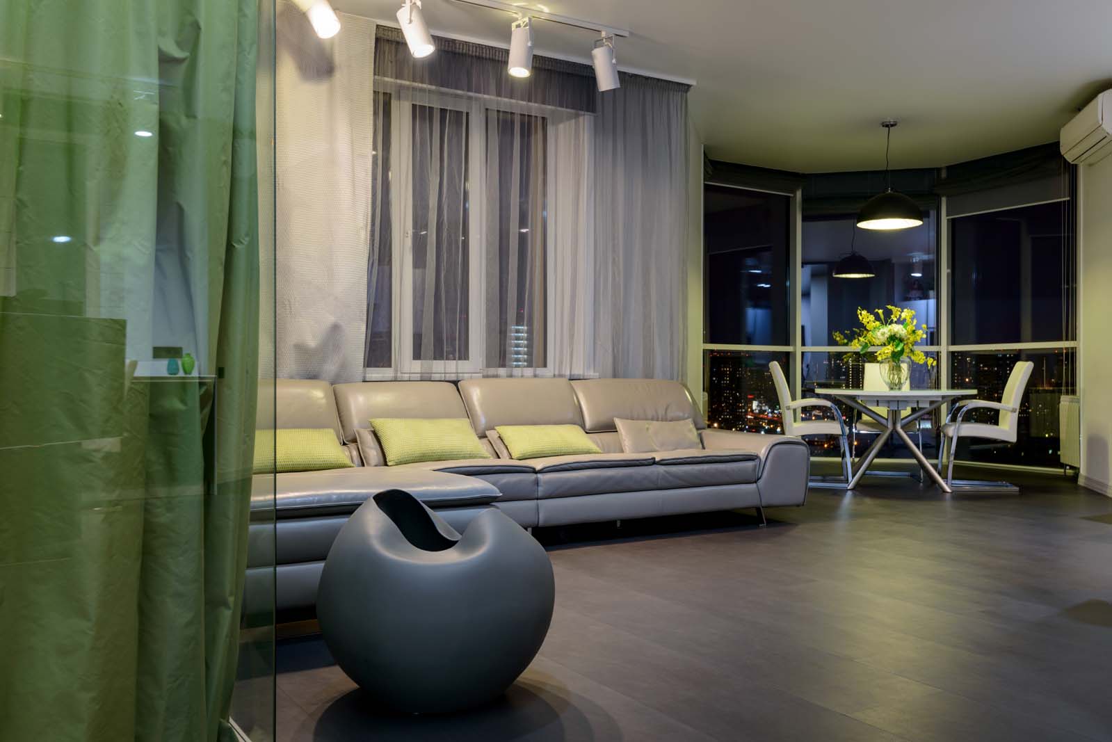 В условиях свободного зонирования днём солнечный свет, а квартира идеально ориентирована на юг и юго-запад, заливает почти каждый угол дома. А закат показывает жильцам неповторимую игру красок каждый день. Имея такой красочный ресурс в арсенале, Наталья Дрогунова решила не перегружать пространство цветовыми полотнами, и сделать интерьер спокойной гамме оттенков белого, серого и графитово — чёрного. Оливково-зеленый разбавил монохром и явился дополнением к природный цветовой палитре, которую видно в панорамные окна.