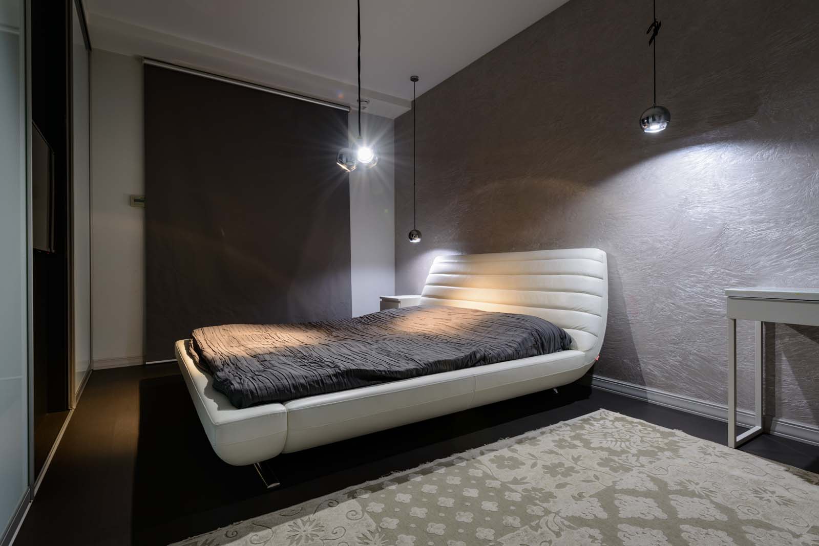 Квартира выполнена в эстетике функционального минимализма. И спальня не исключение. Тактично интегрированный на стену шкафа — гардеробной TV, не мешает дверям огромного размера откатываться в стороны. Огромная и мягкая кожаная кровать и ничего лишнего.