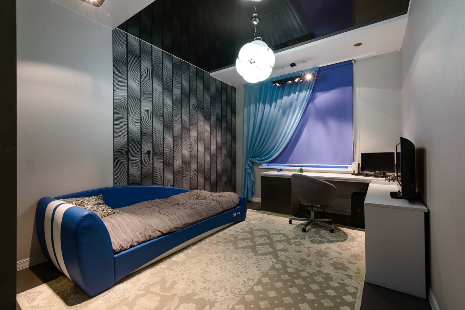 Во второй детской преобладают темные и черные цвета. Они были применены, так как подрастающий будущий жилец выбрал их самостоятельно и осознанно. Поэтому графические обои и глянцевый потолок черного оттенка. Спокойный синий в деталях дополнил темно-серую гамму.